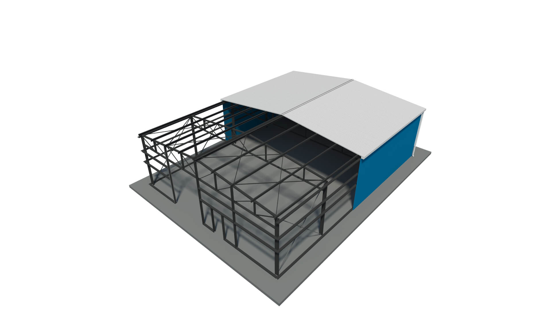 KIT.18x24 MINIMAL è un capannone indipendente a doppia falda costituito da strutture zincate a caldo, pannelli sandwich ciechi, porta d'ingresso e portone scorrevole.